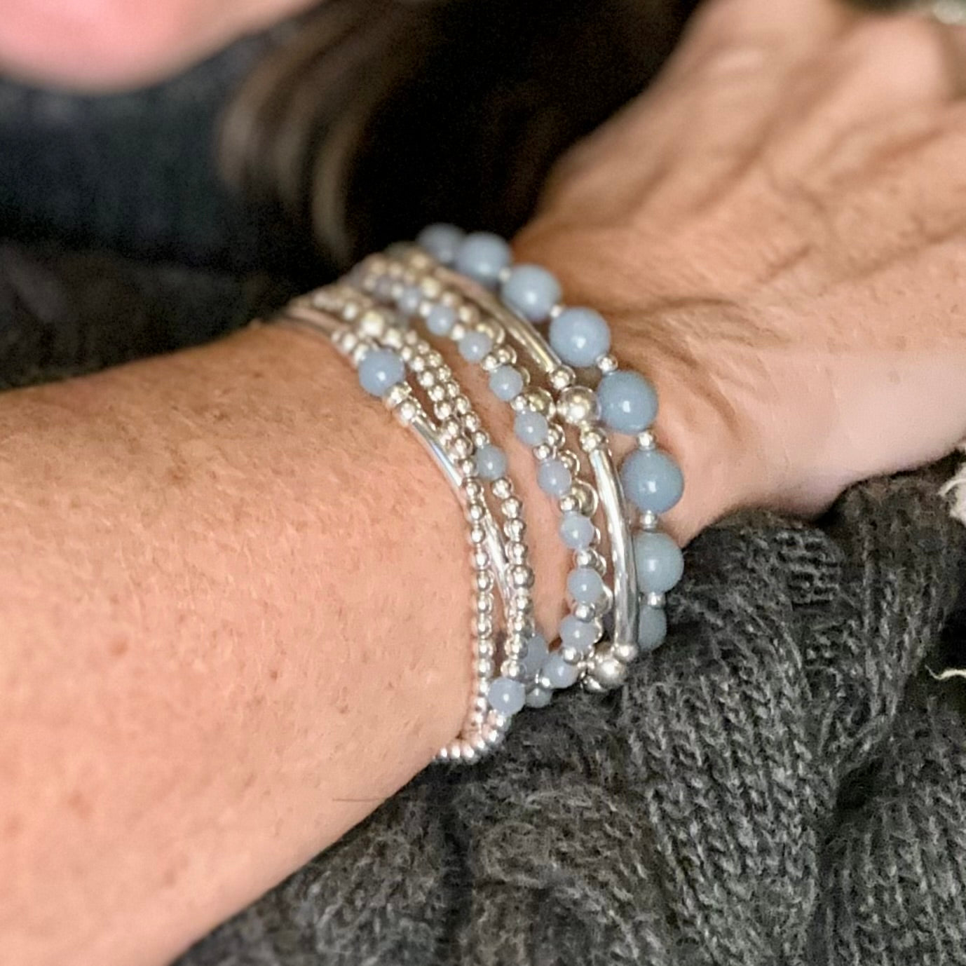 Showcasing the Angelite Bracelet Stack, a beautiful trio featuring serene angelite gemstones complemented by classic 925 Sterling Silver accents.