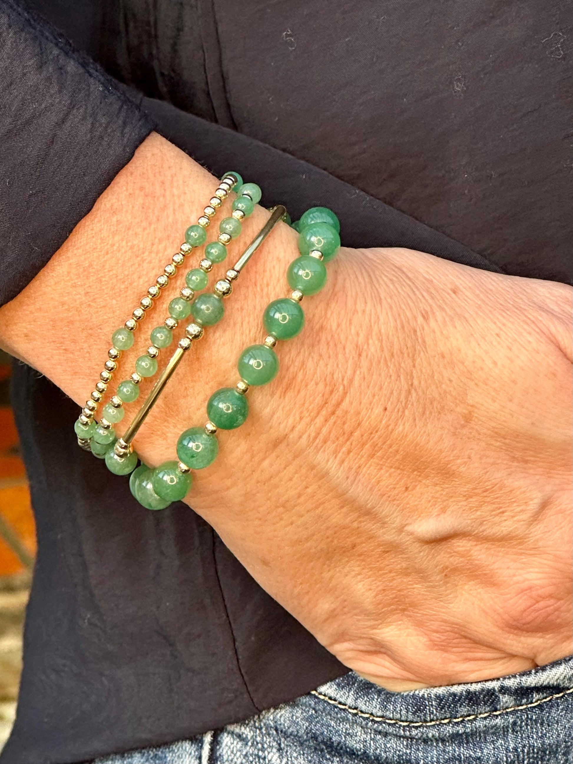 Introducing the Aventurine Stack Builder, a radiant addition to your collection. This bracelet features vibrant green aventurine stones, beautifully paired with luxurious 14k Gold accents, creating a look that’s both striking and timeless.