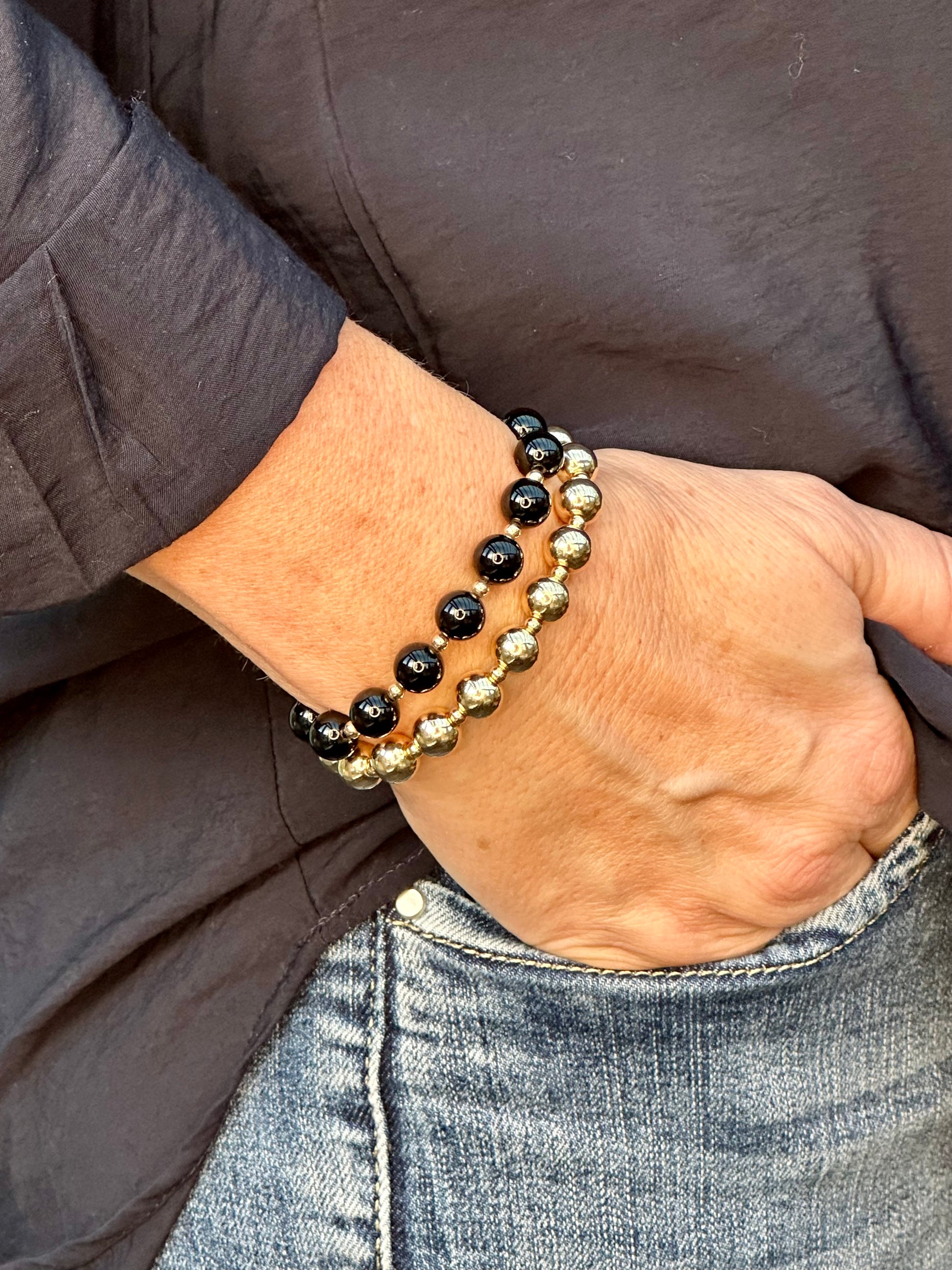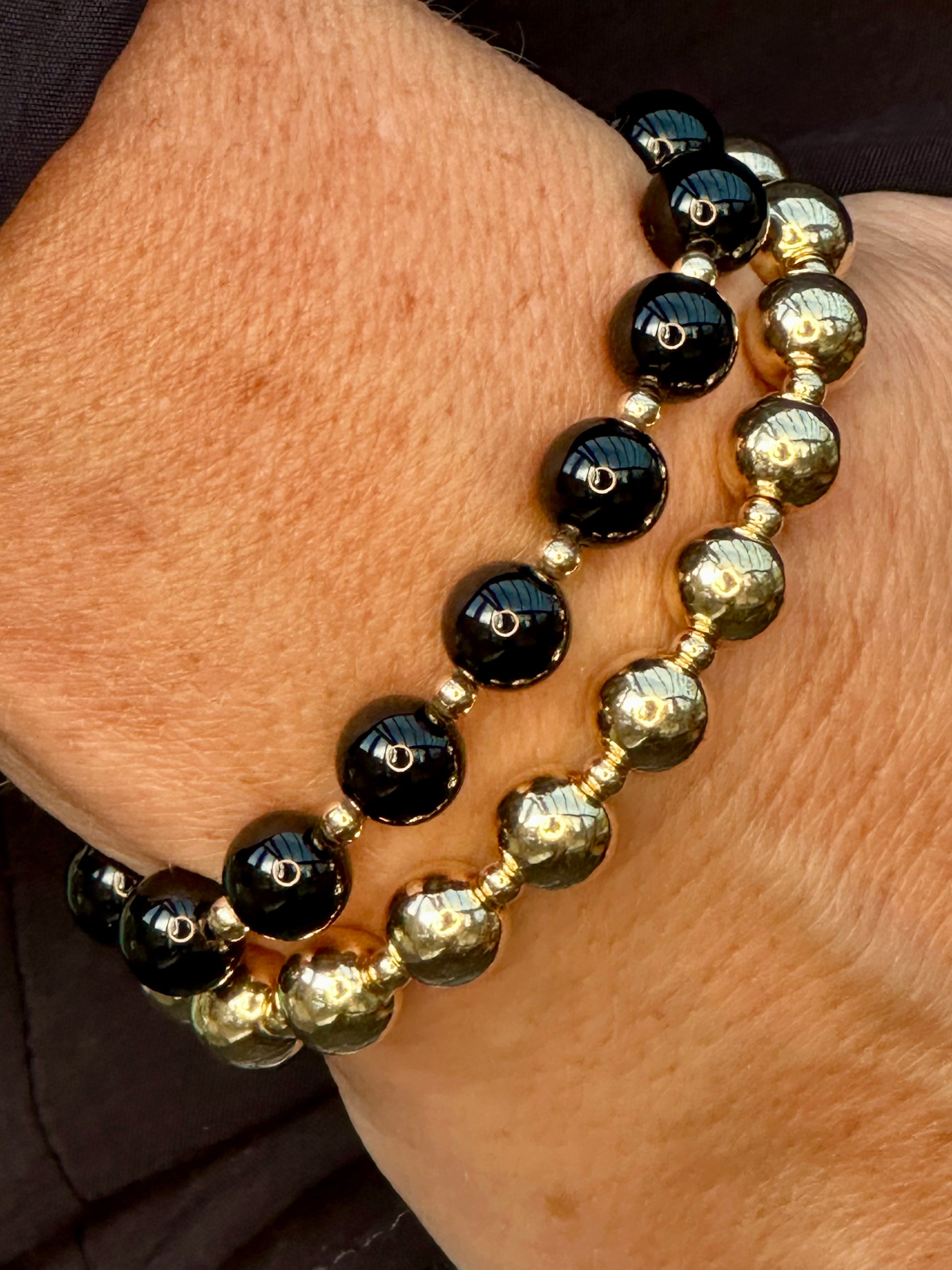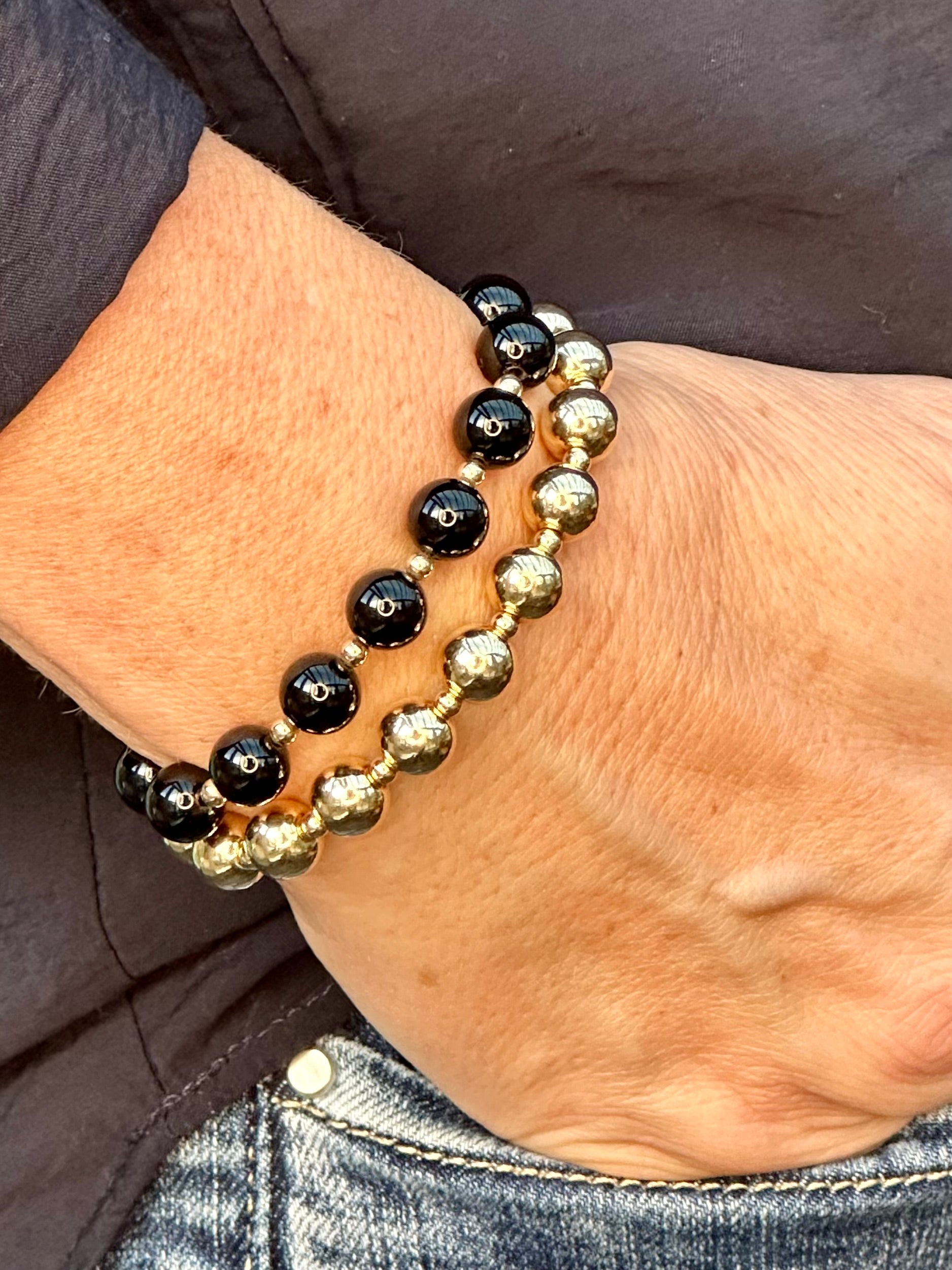Introducing the Black Onyx Stack Builder, a powerful addition to your collection. This bracelet features striking oversized black onyx stones paired with refined 14k Gold accents, delivering a look of sophistication and bold elegance.