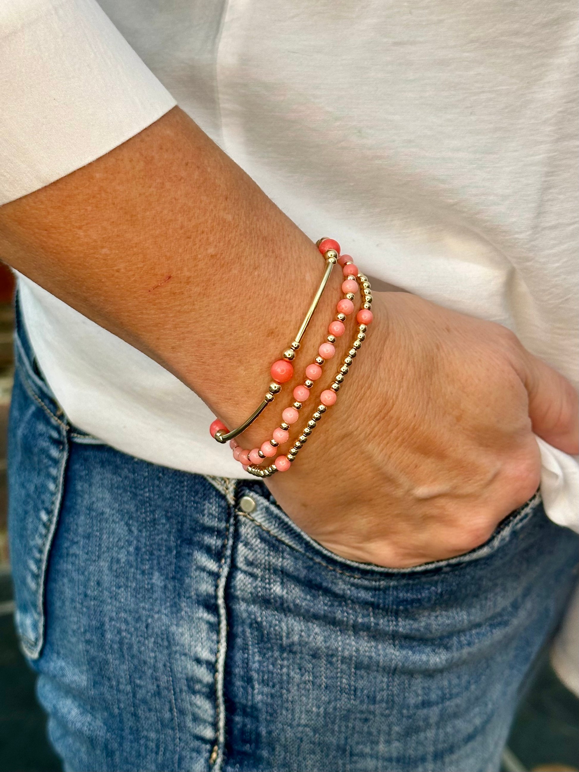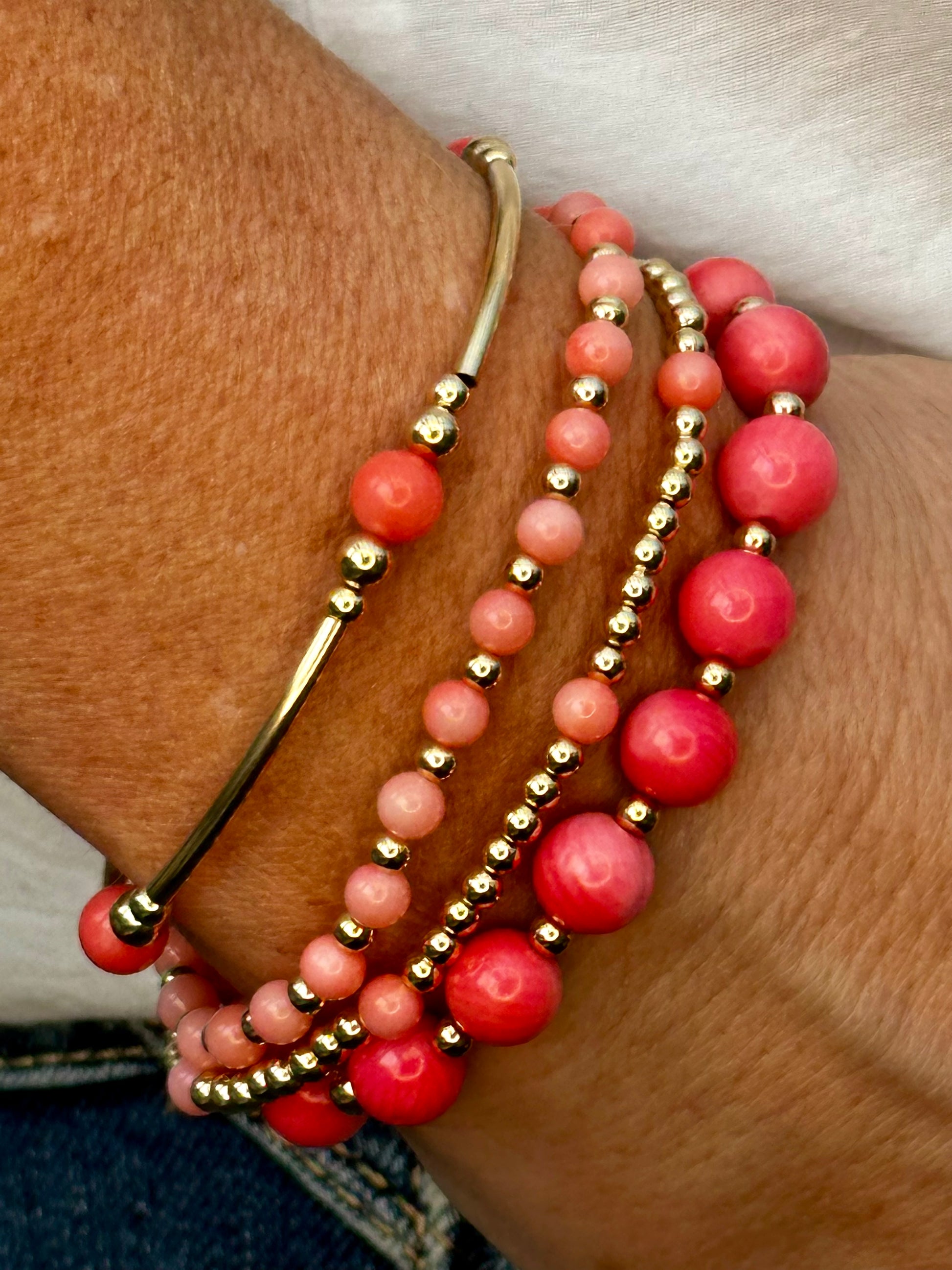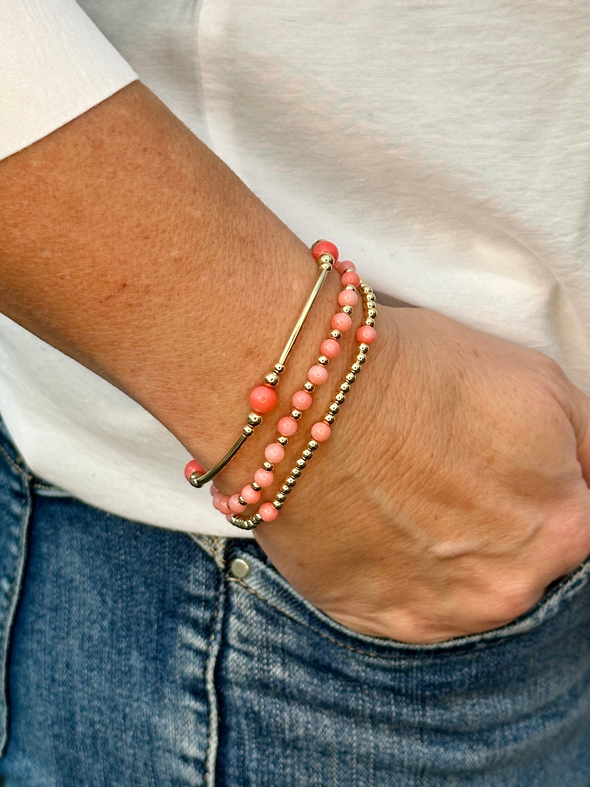 Explore the Coral Bracelet Stack, a vibrant trio showcasing bold coral gemstones beautifully accented with elegant 14k Gold.