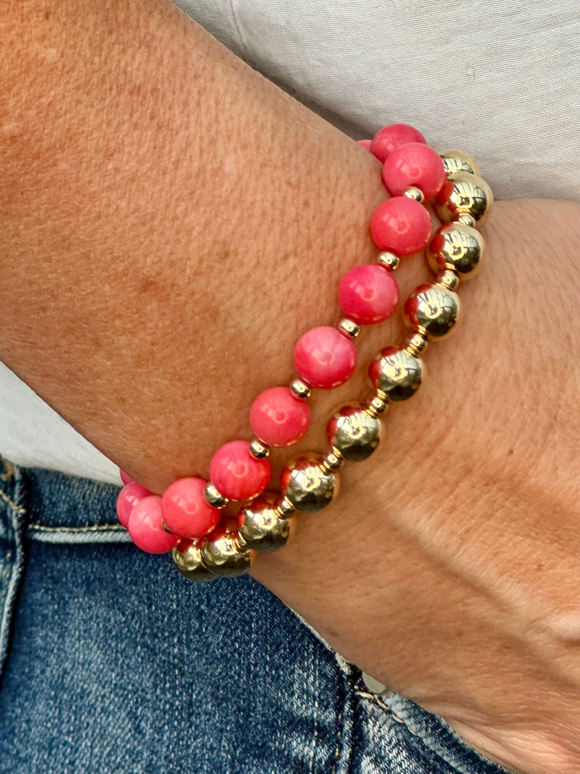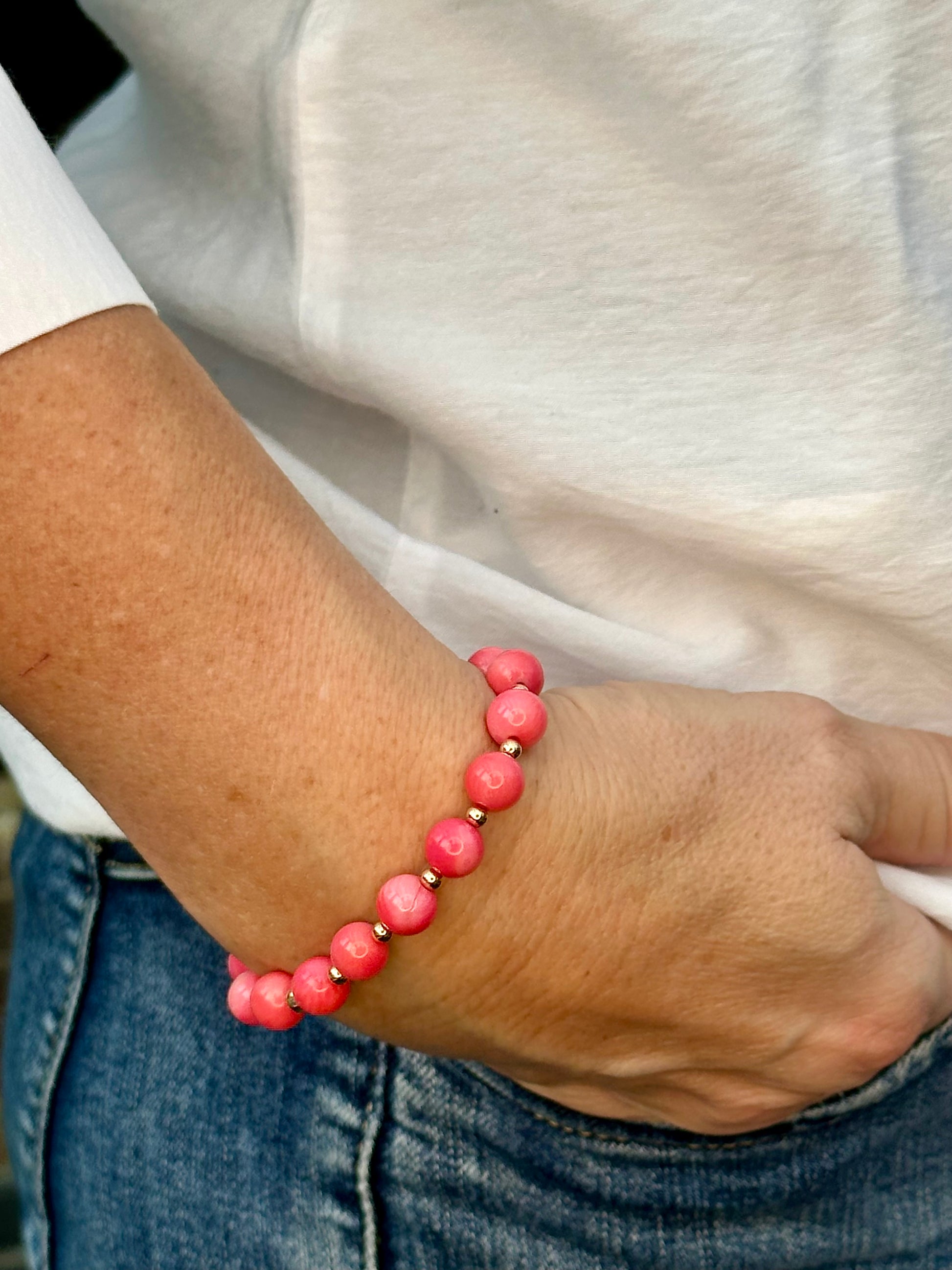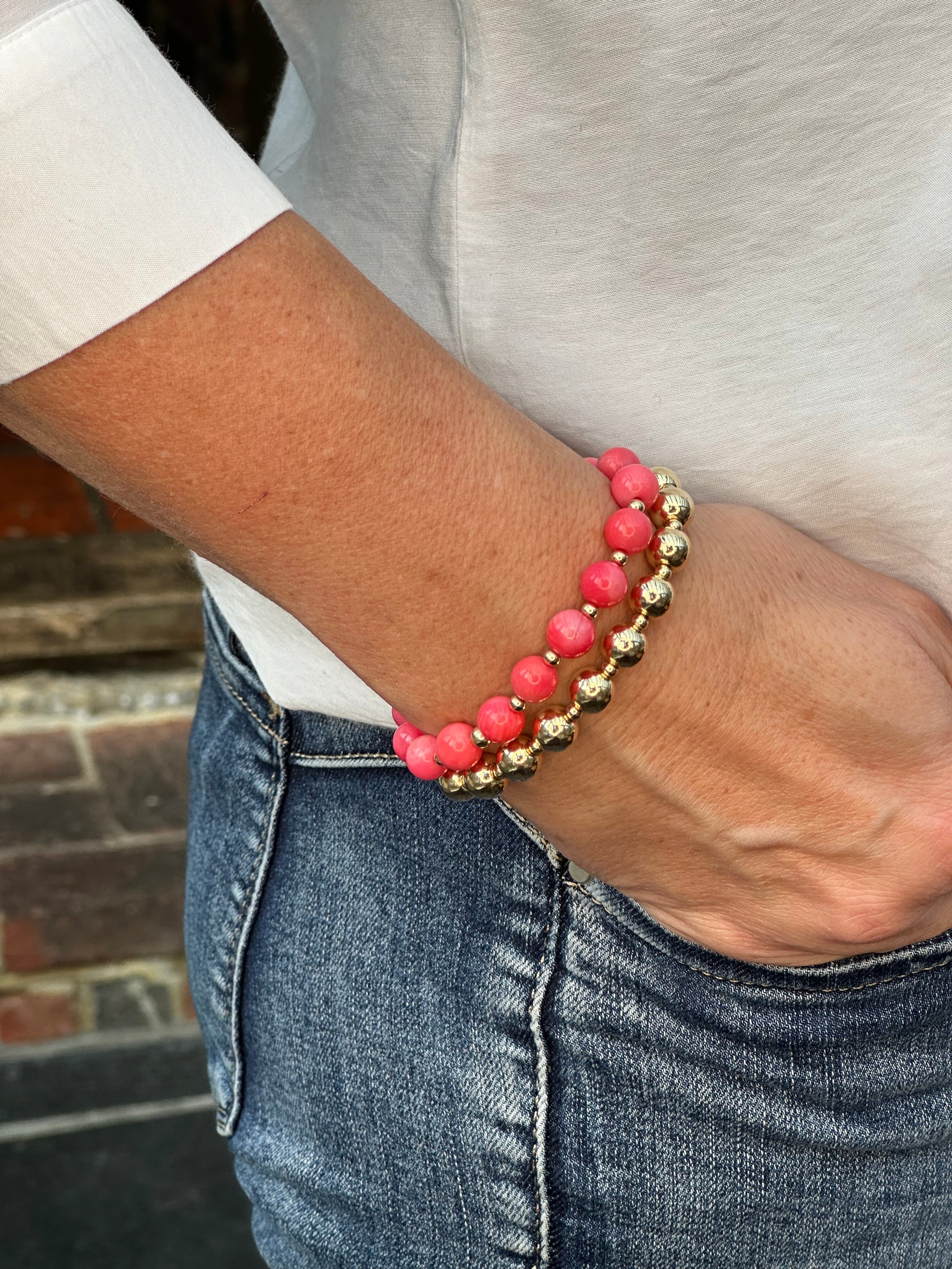 Introducing the Coral Stack Builder, a lively and captivating addition to your collection. This bracelet features stunning coral stones, beautifully contrasted with 14k Gold accents, creating a rich and radiant style that stands out.