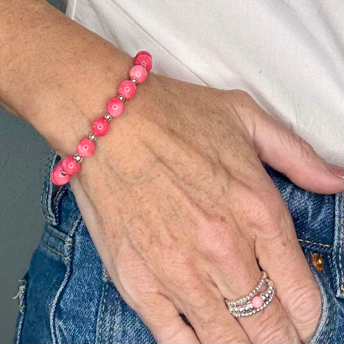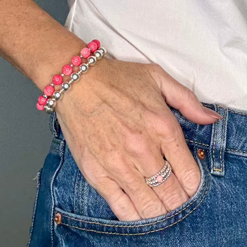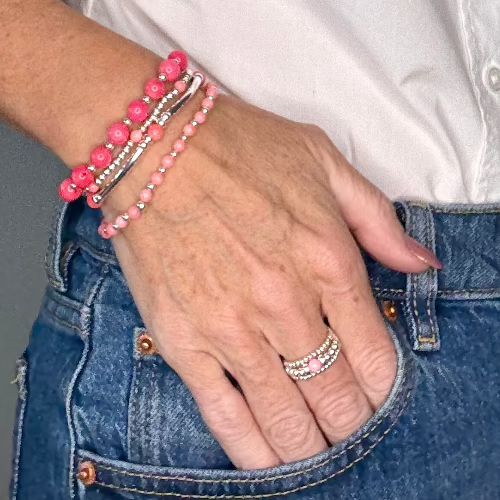 Meet the Coral Stack Builder, a vibrant and elegant addition to your collection. This bracelet features the rich, warm hues of coral stones, beautifully paired with polished 925 Sterling Silver accents, creating a look that is both bold and refined.