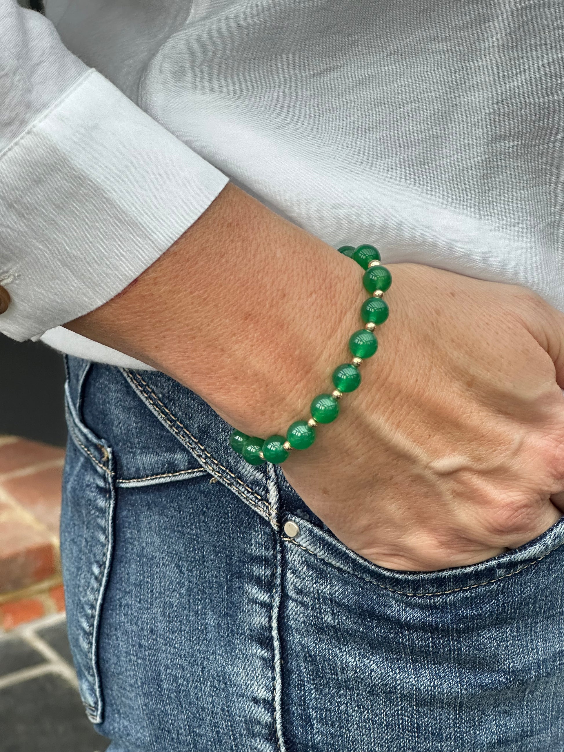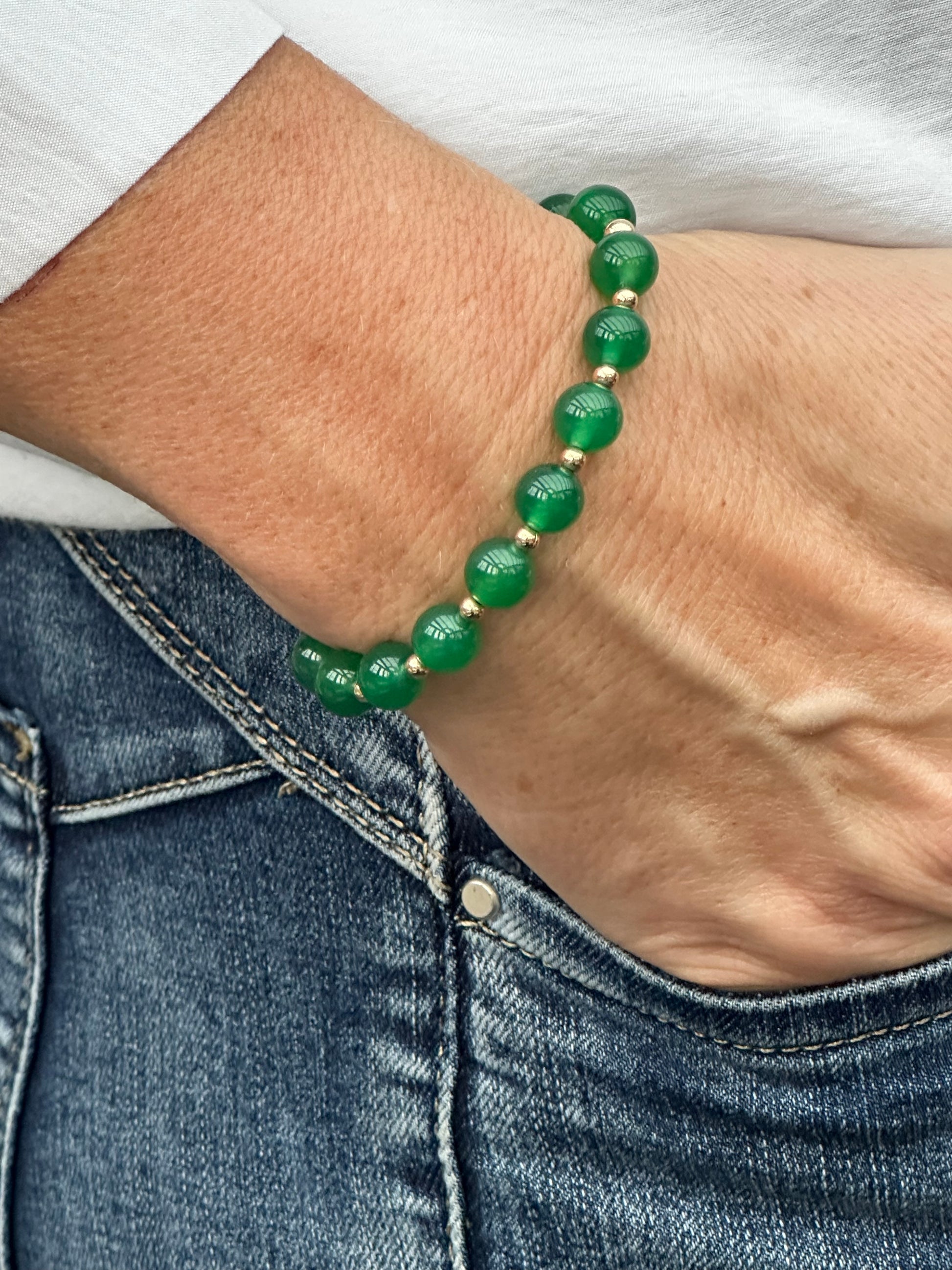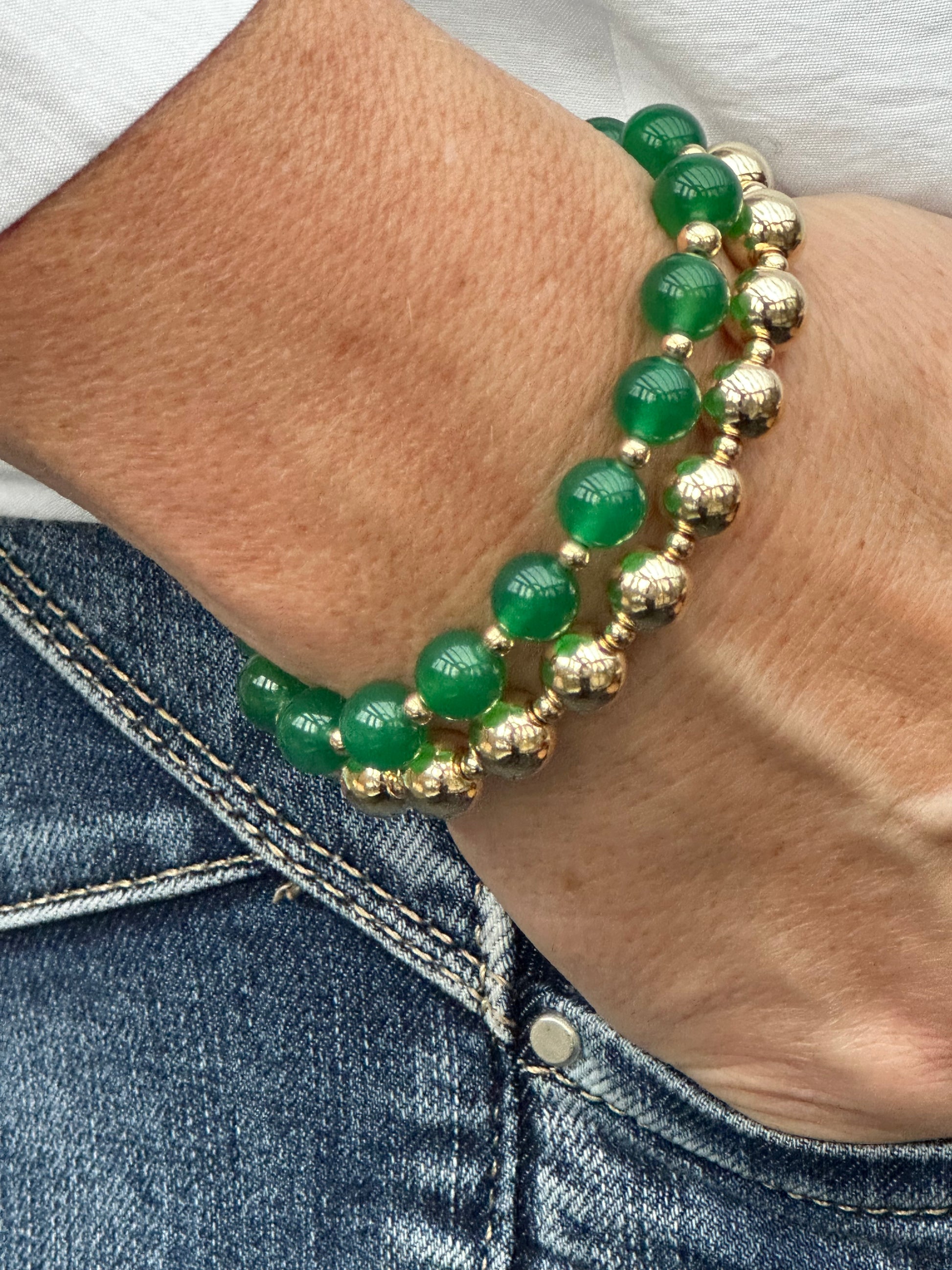 Introducing the Green Agate Stack Builder, a fresh and striking addition to your collection. This bracelet features rich green agate stones paired with luxurious 14k Gold accents, creating a look that’s both grounded and sophisticated.