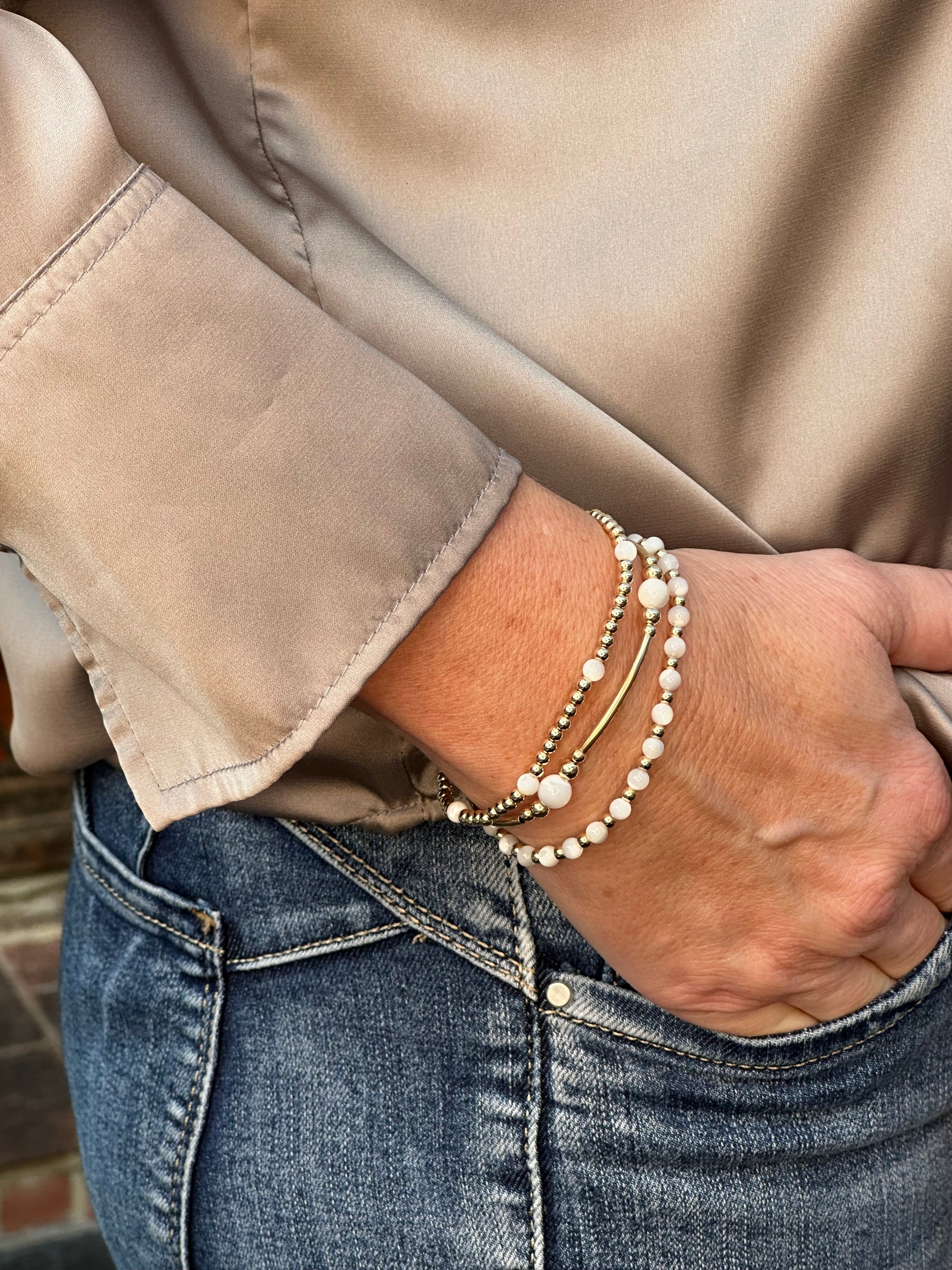 Discover the Mother of Pearl Bracelet Stack, an elegant trio featuring luminous mother of pearl gemstones beautifully accented by refined 14k Gold.