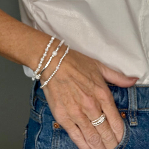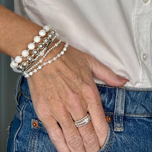Discover the Mother of Pearl Bracelet Stack, an elegant trio featuring luminous mother of pearl gemstones beautifully accented by classic 925 Sterling Silver.