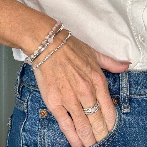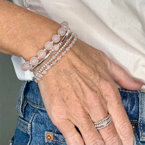 Discover the Rose Quartz Bracelet Stack, a charming trio featuring soft rose quartz gemstones beautifully accented by classic 925 Sterling Silver.