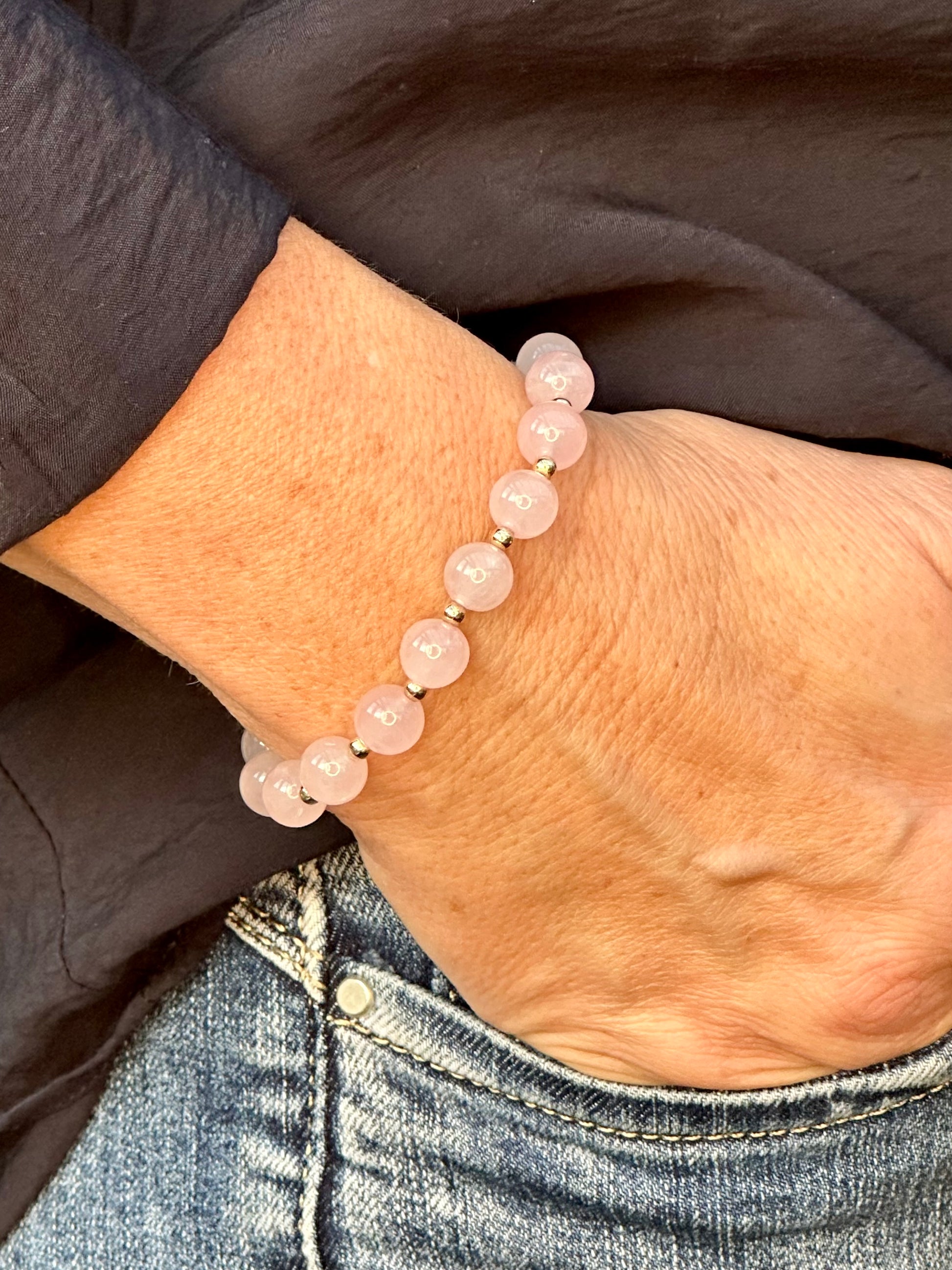 Introducing the Rose Quartz Stack Builder, a romantic and timeless addition to your collection. This bracelet features soft pink rose quartz stones, paired with luxurious 14k Gold accents, creating a look that’s both gentle and captivating.