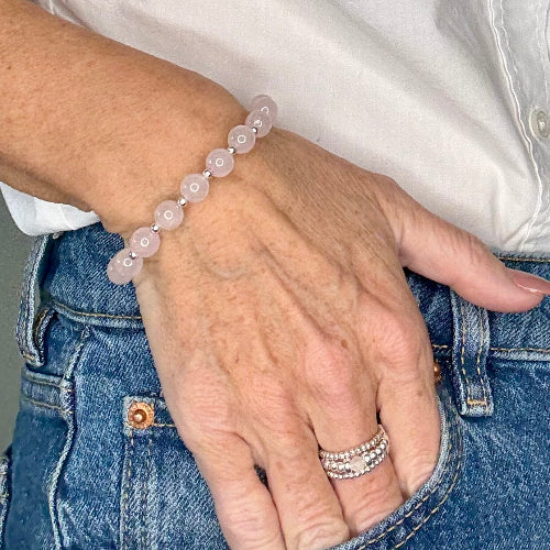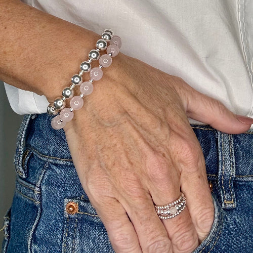 Meet the Rose Quartz Stack Builder, a delicate and timeless addition to your collection. This bracelet features the soft, blush-pink hues of rose quartz stones, beautifully complemented by polished 925 Sterling Silver accents, creating a look that is both romantic and refined.