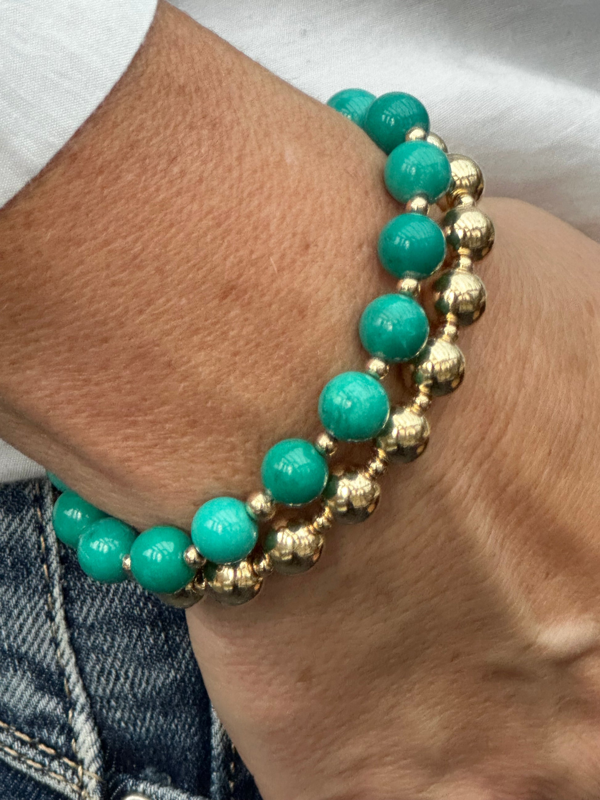 Meet the Turquoise Stack Builder, a captivating addition to your collection. This bracelet features the vivid blue-green hues of natural turquoise stones, beautifully contrasted with 14k Gold accents, creating a look that is both refreshing and sophisticated.