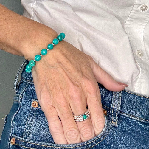 Introducing the Turquoise Stack Builder, a vibrant and elegant addition to your collection. This bracelet showcases the vivid blue-green tones of turquoise stones, beautifully complemented by polished 925 Sterling Silver accents, creating a look that’s both refreshing and sophisticated.