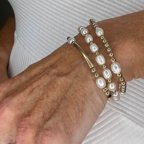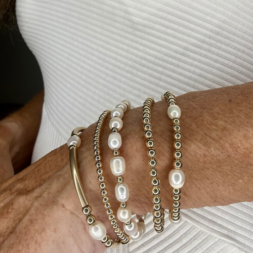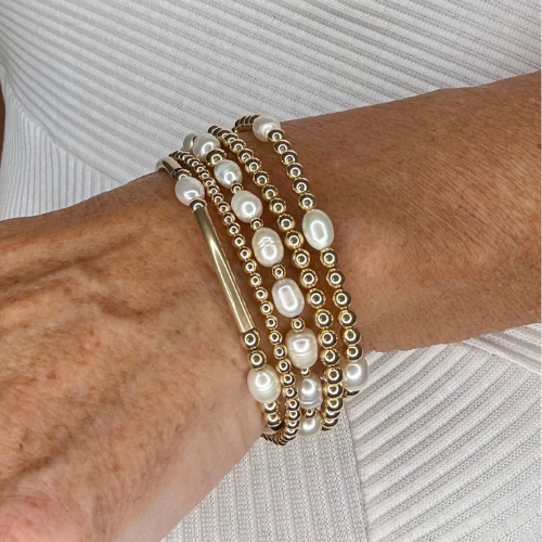Add a touch of effortless elegance to your summer style with our Freshwater Pearl Beaded Bracelet Stack, beautifully handcrafted with 14k gold beads and precious organic freshwater pearls.